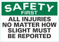 Safety First Sign: All Injuries No Matter How Slight Must Be Reported