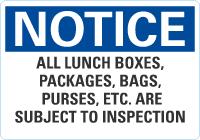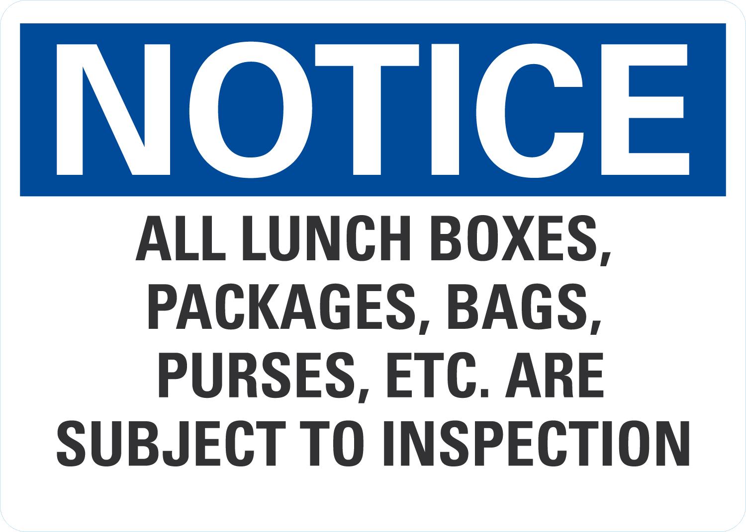 OSHA Notice Sign: All Lunch Boxes, Packages, Bags, Purses, Etc. Are Subject To Inspection
