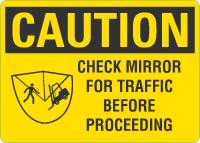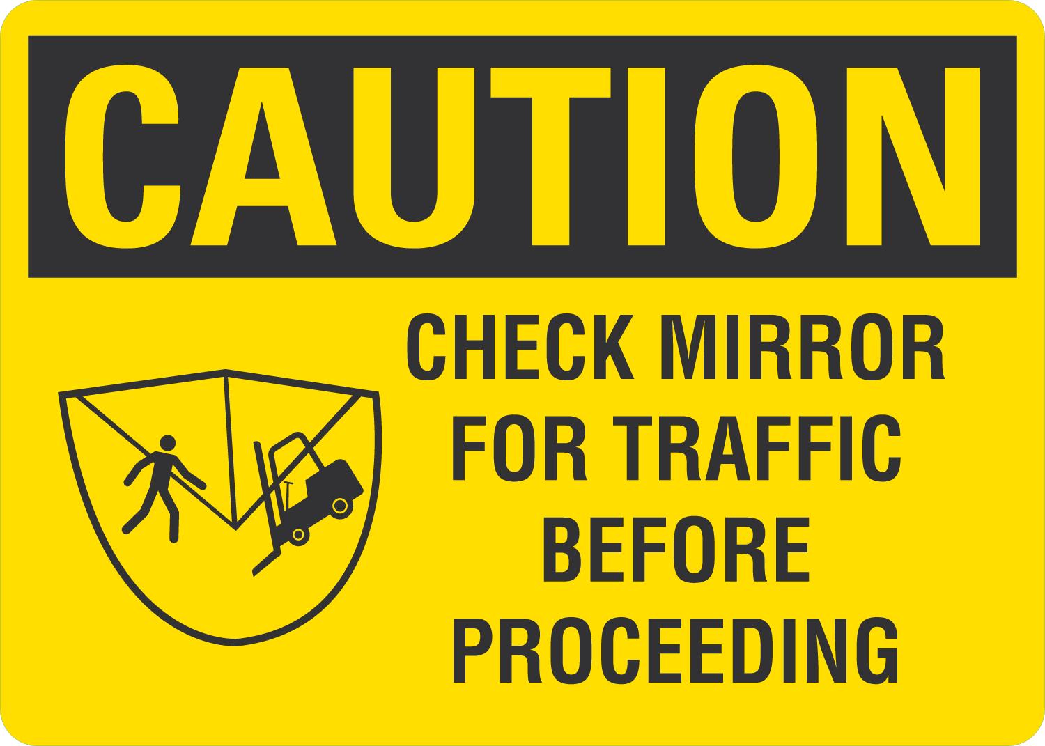OSHA Caution Sign: Check Mirror For Traffic Before Proceeding With