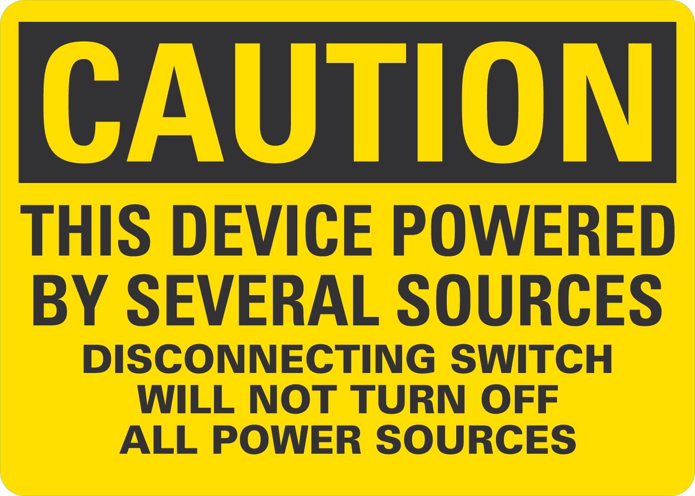 Caution OSHA Sign: This Device Powered By Several Sources - Disconnecting Switch Will Not Turn Off All Power Sources