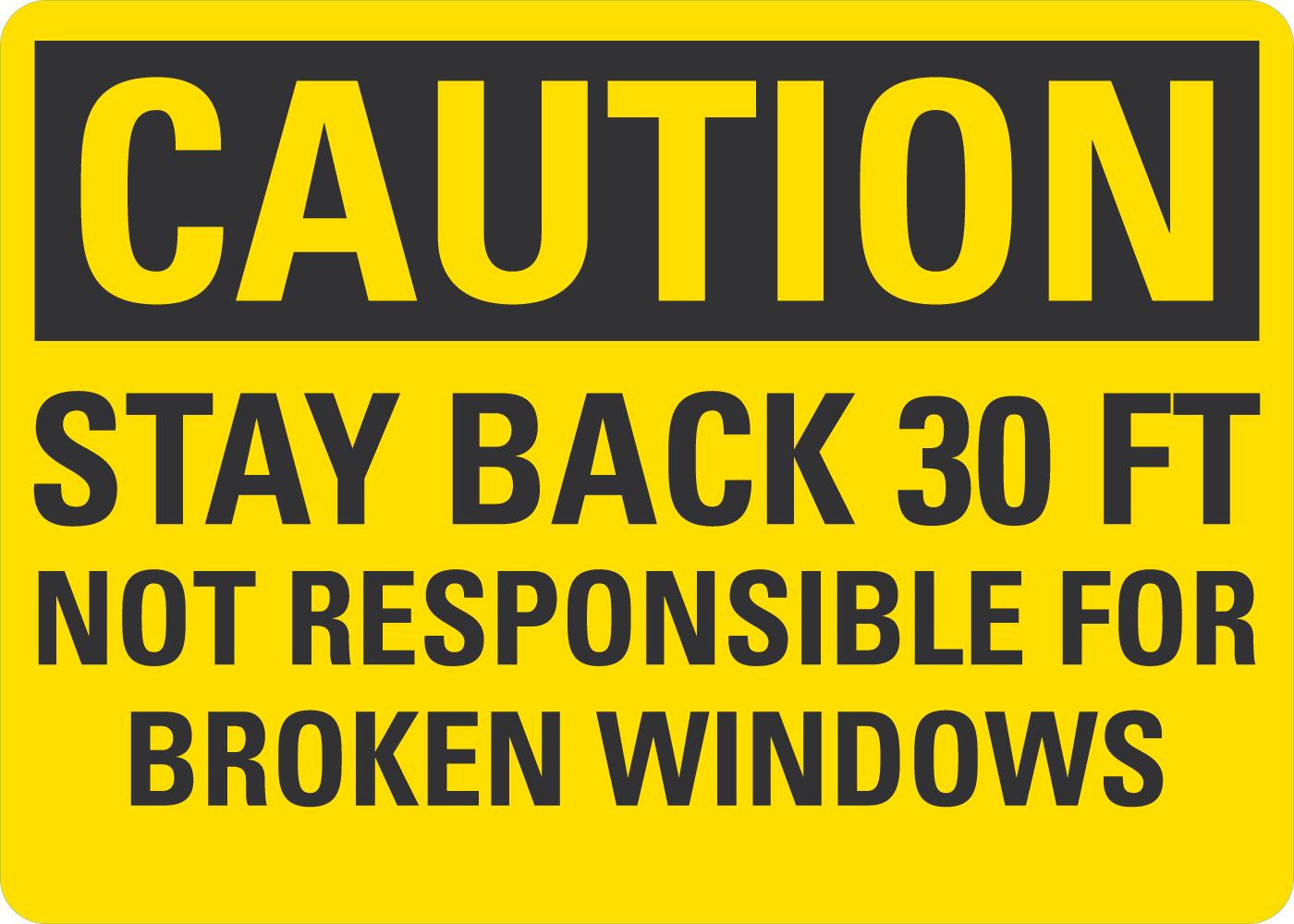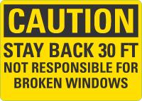 Caution OSHA Sign: Stay Back 30 Ft. - Not Responsible For Broken Windows