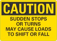Caution OSHA Sign: Sudden Stops Or Turns May Cause Loads To Shift Or Fall