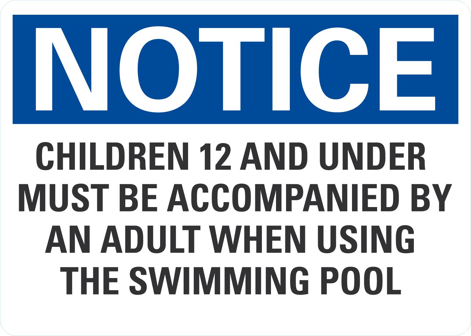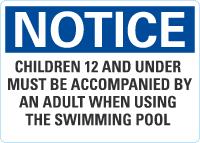 OSHA Notice Sign: Children 12 And Under Must Be Accompanied By An Adult When Using The Swimming Pool