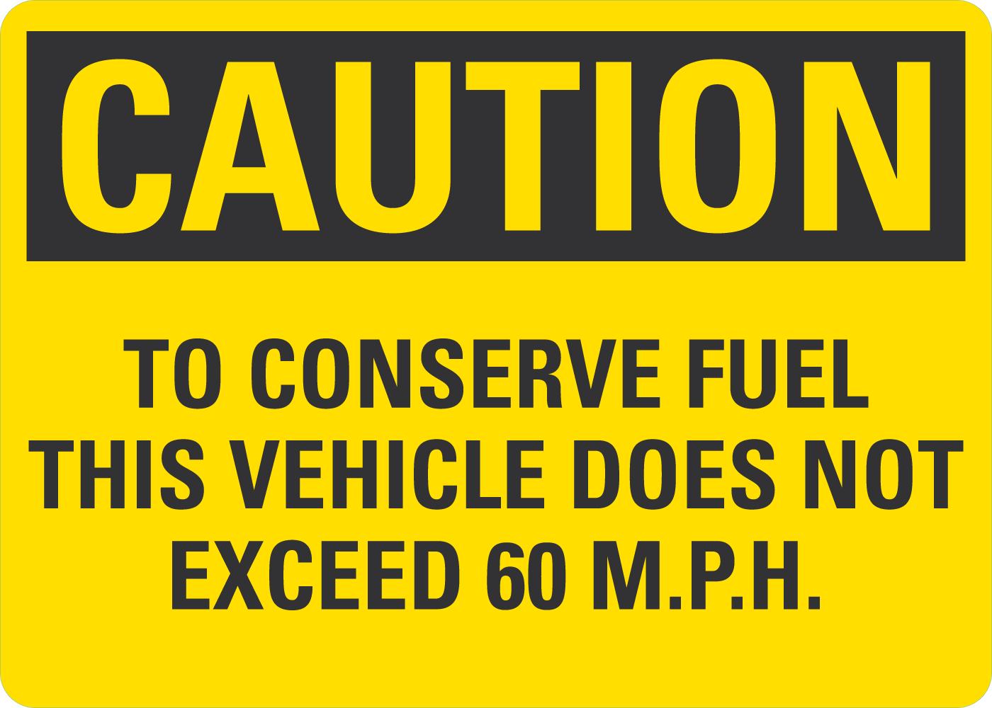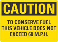 Caution OSHA Sign: To Conserve Fuel This Vehicle Does Not Exceed 60 M.P.H