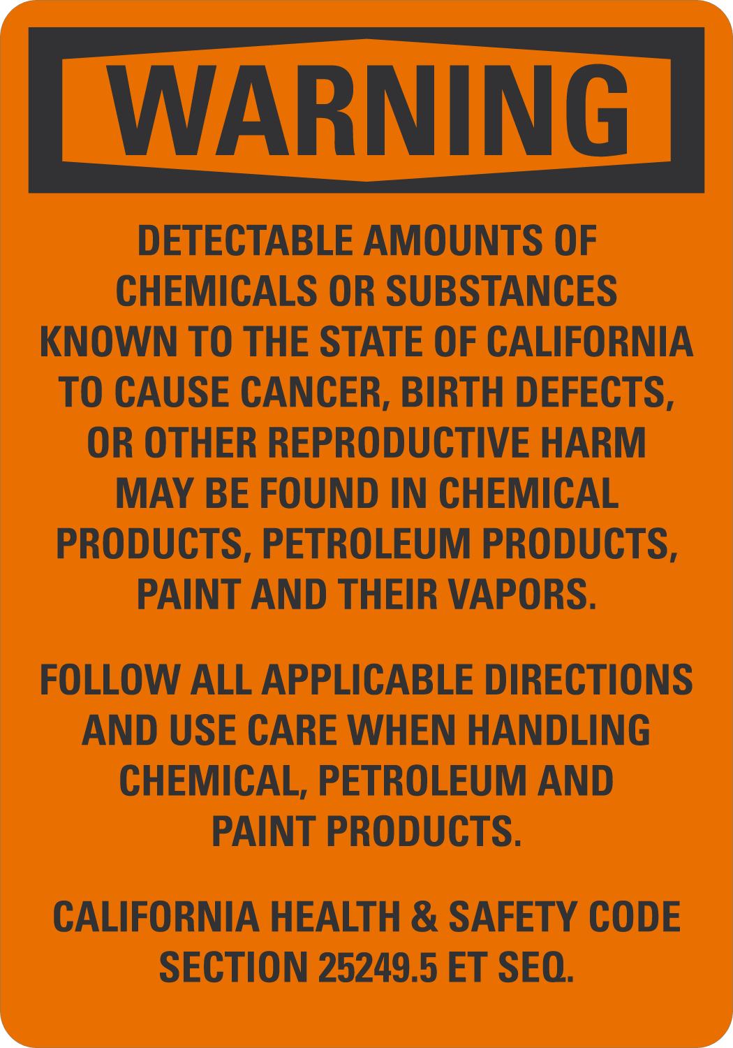 OSHA Warning Sign: Detectable Amounts Of Chemicals Or Substances Known To The State Of California To Cause Cancer, Birth Defects, Or Other Reproductive Harm