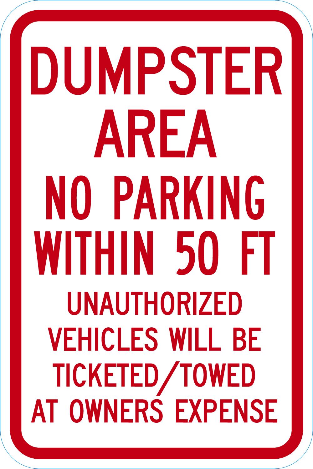 Dumpster Area Sign: No Parking Within 50 Ft, Unauthorized Vehicles Will be Ticketed / Towed at Owners Expense