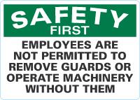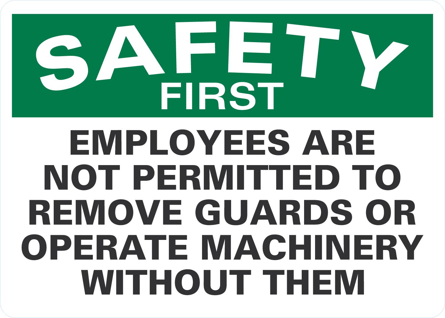 OSHA Safety First Sign: Employees Are Not Permitted To Remove Guards Or Operate Machinery Without Them
