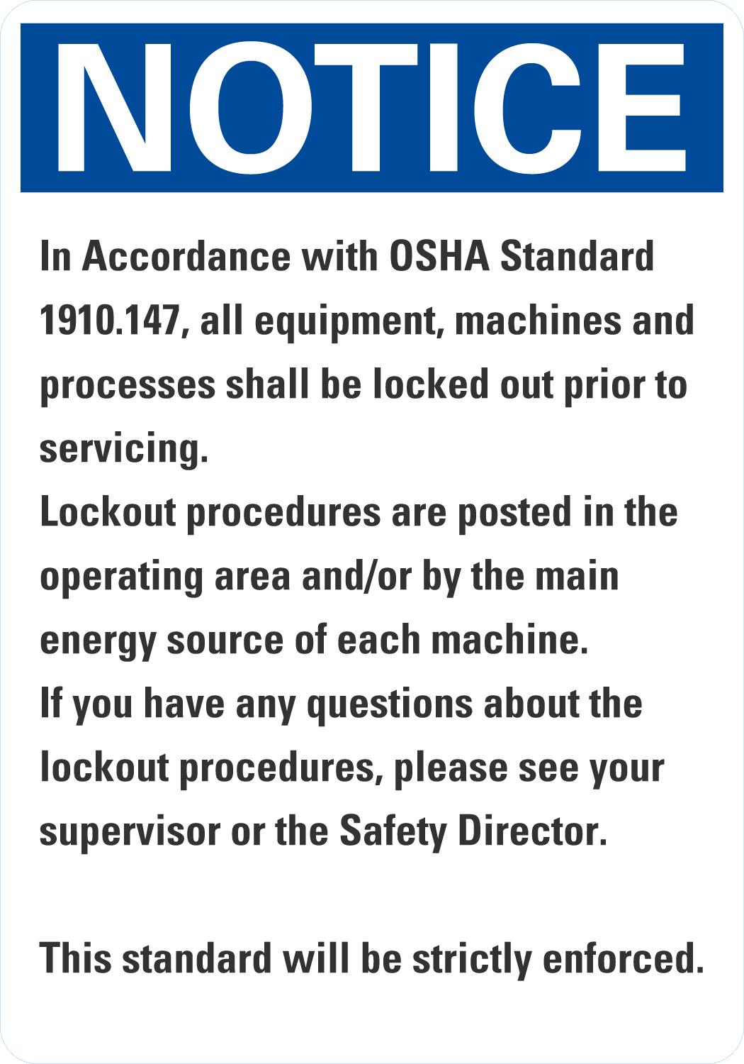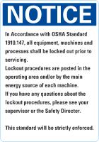 OSHA Notice Sign: In Accordance With OSHA Standard 1910.147, All Equipment, Machines & Processes Shall Be Locked Out Prior To Servicing