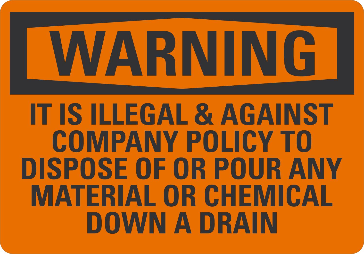 OSHA Warning Sign: It Is Illegal & Against Company Policy To Dispose Of Or Pour Any Materials Or Chemical Down A Drain