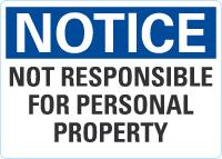 OSHA Notice Sign: Not Responsible For Personal Property