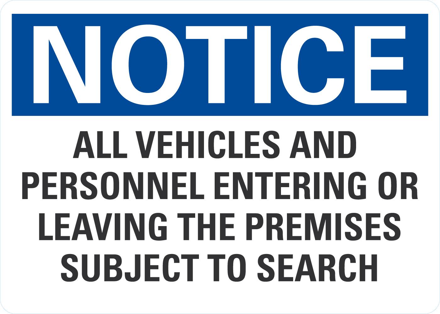 OSHA Notice Sign: All Vehicles & Personnel Entering Or Leaving The Premises Subject To Search