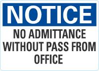 Notice OSHA Sign: No Admittance Without A Pass From Office