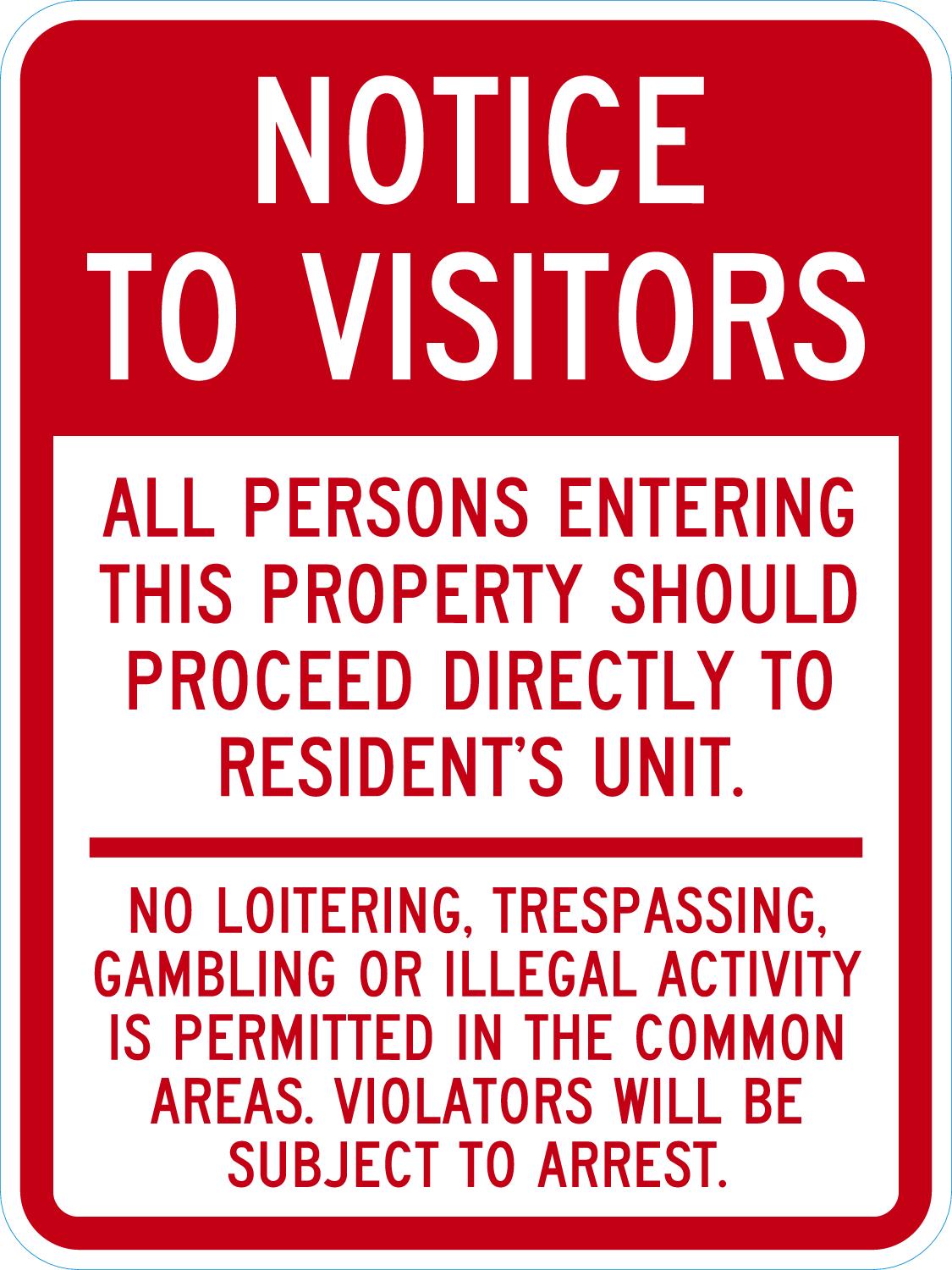 Notice Sign: Notice To Visitors - All Persons Entering This Property Should Proceed Directly To Resident's Unit