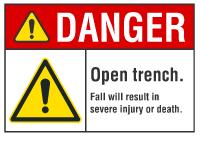 ANSI Danger Sign: Open Trench - Fall Will Result In Severe Injury Or Death