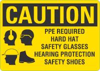 OSHA Caution Sign: PPE Required Hard Hat Safety Glasses Hearing Protection Safety Shoes