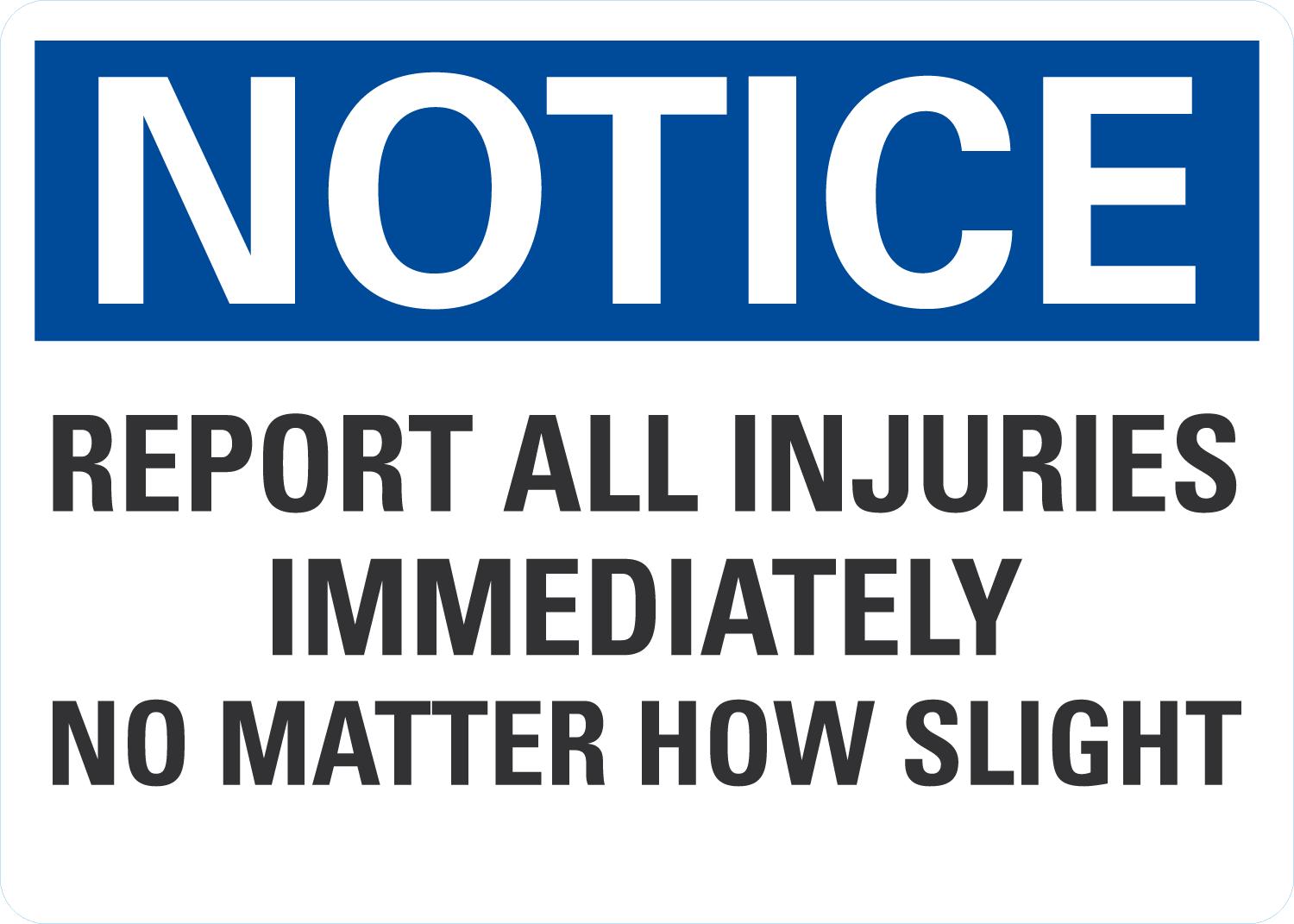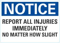 Notice OSHA Sign: Report All Injuries Immediately No Matter How Slight
