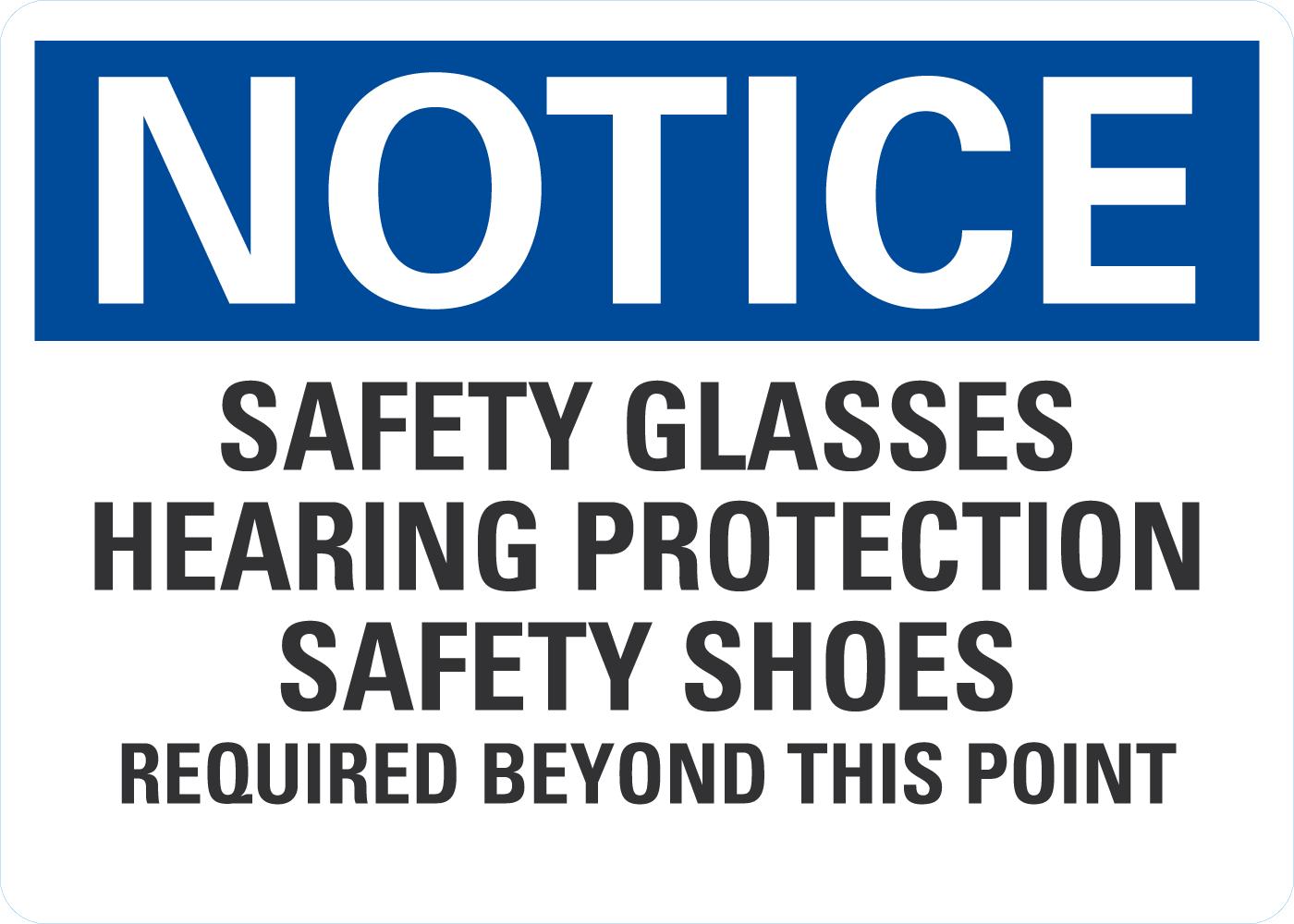 Notice OSHA Sign: Safety Glasses Hearing Protection Safety Shoes Required Beyond This Point