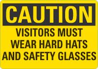 Caution OSHA Sign: Visitors Must Wear Hard Hats And Safety Glasses