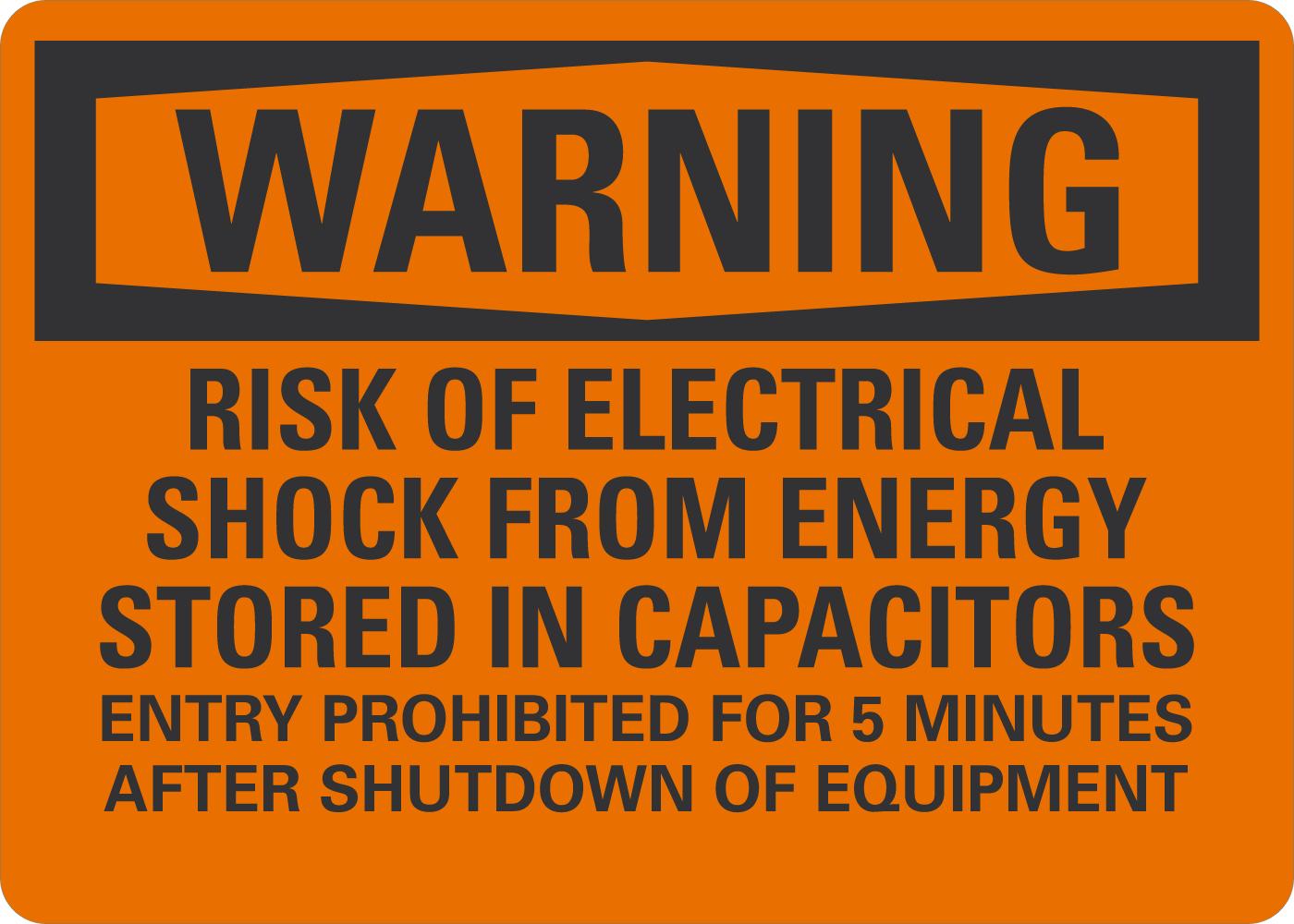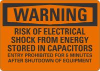 Warning OSHA Sign: Risk Of Electrical Shock From Energy Stored In Capacitors, Entry Prohibited For 5 Minutes After Shutdown Of Equipment