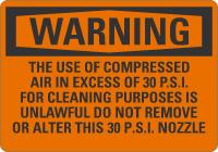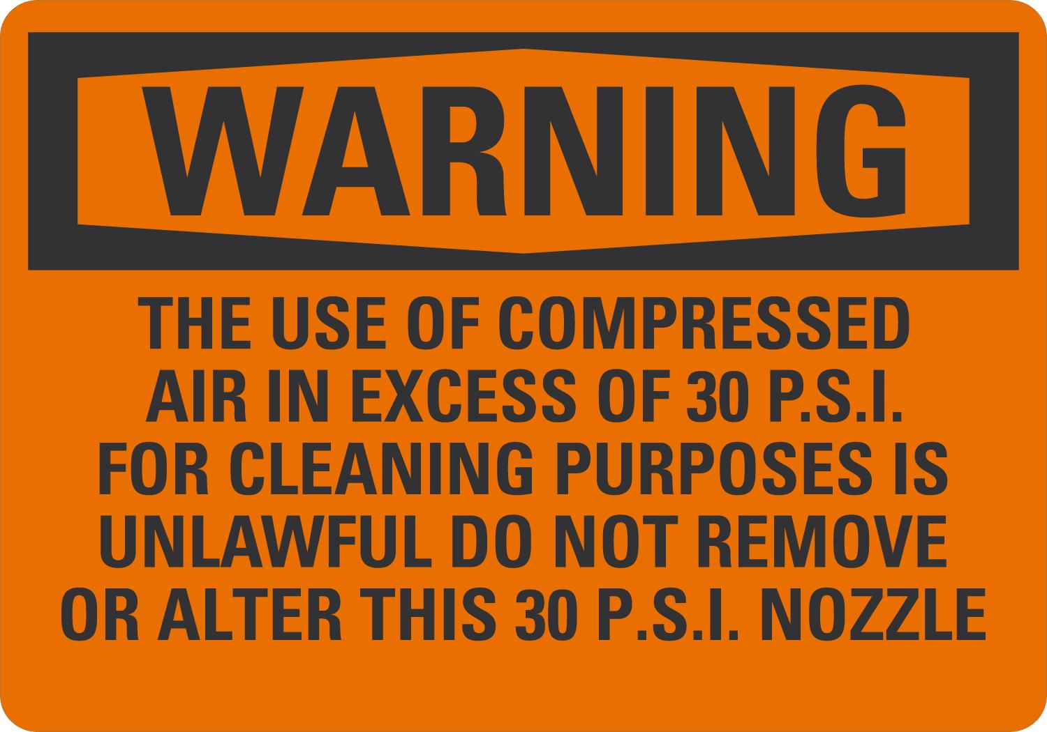 Warning OSHA Sign: The Use Of Compressed Air In Excess Of 30 P.S.I For Cleaning Purposes Is Unlawful Do Not Remove Or Alter This 30 P.S.I Nozzle