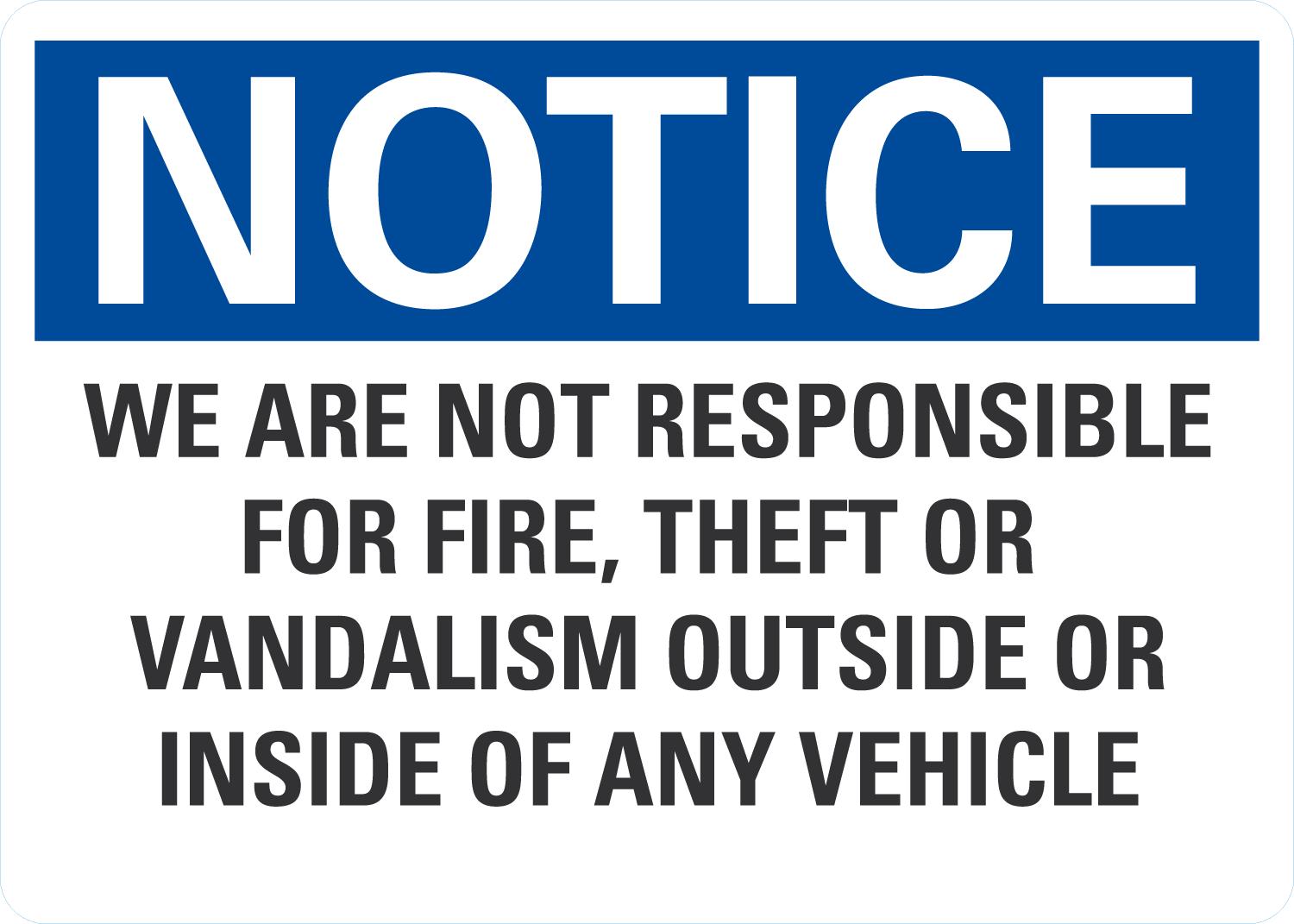 OSHA Notice Sign: We Are Not Responsible For Fire, Theft Or Vandalism Outside Or Inside Of Any Vehicle