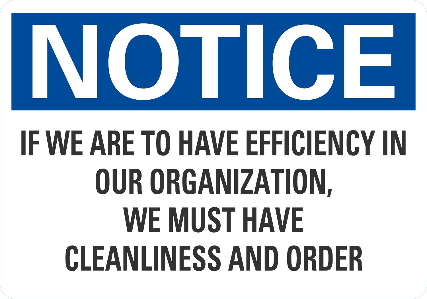 OSHA Notice Sign: If We Are To Have Efficiency In Our Organization, We Must Have Cleanliness And Order