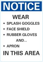 OSHA Notice Sign: Wear Splash Goggles, Face Shield, Rubber Gloves, Apron In This Area