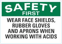 OSHA Safety First Sign: Wear Face Shields, Rubber Gloves and Aprons When Working With Acids