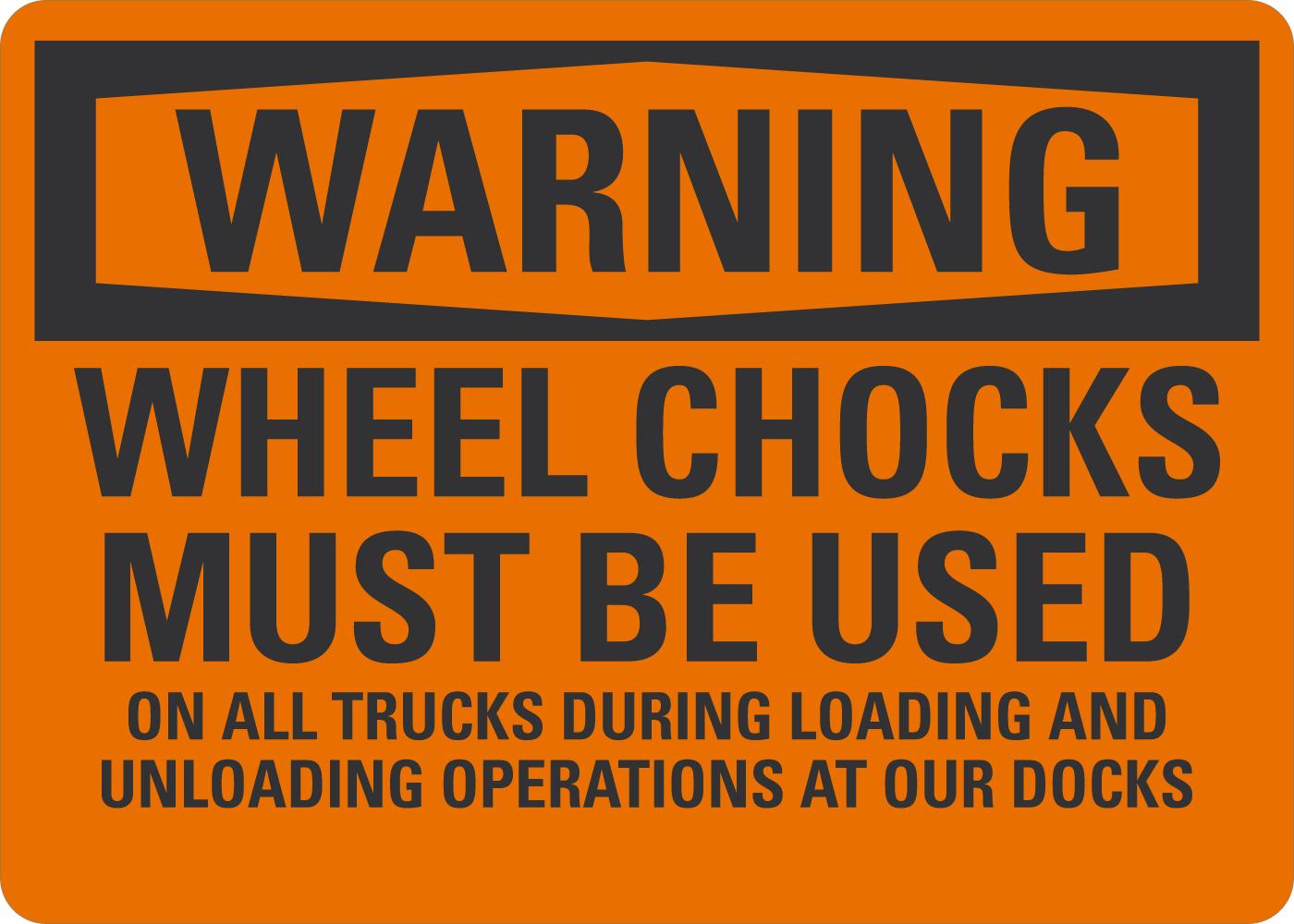 Warning OSHA Sign: Wheel Chocks Must Be Used On All Trucks During Loading And Unloading Operations At Our Docks